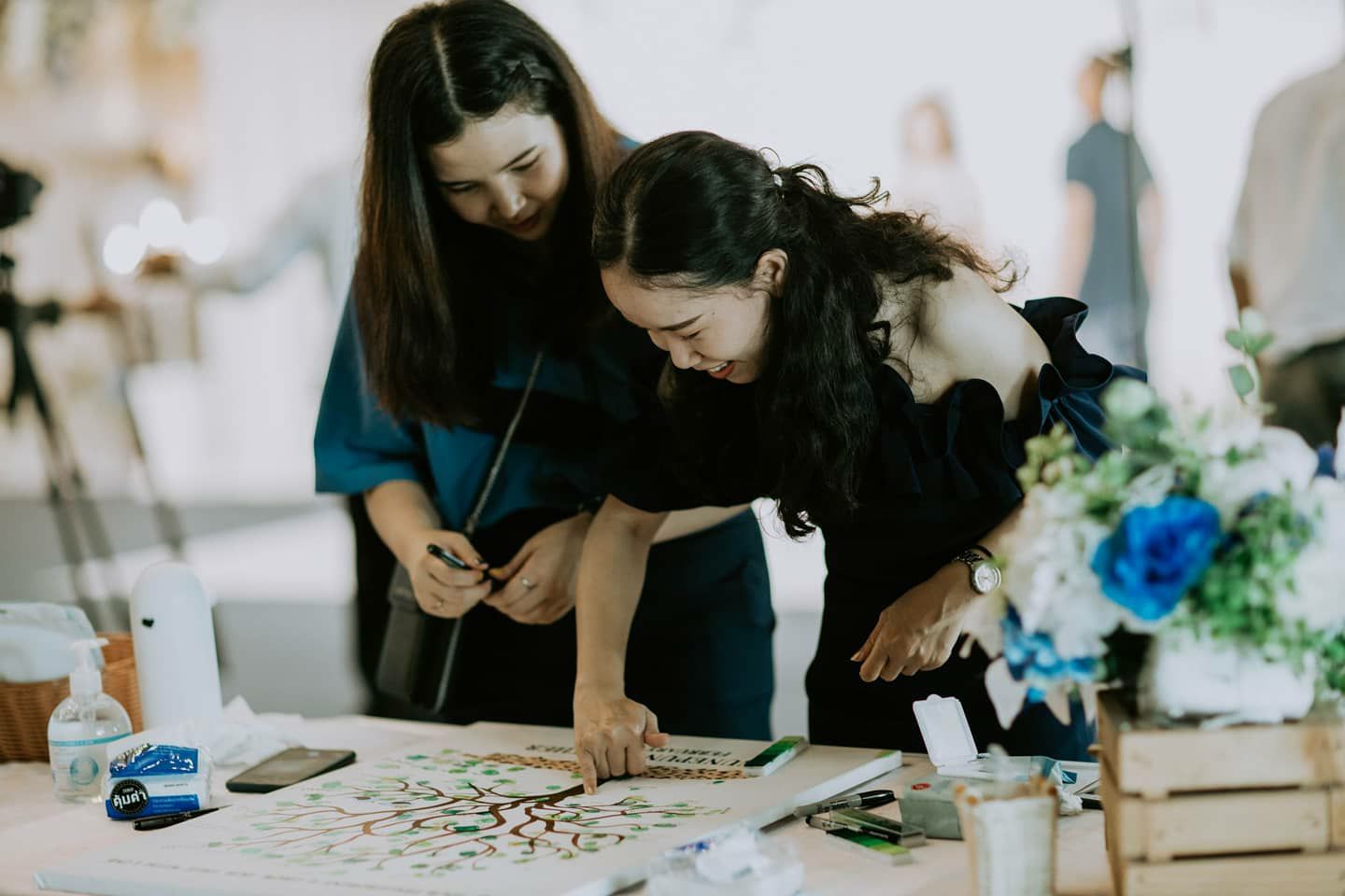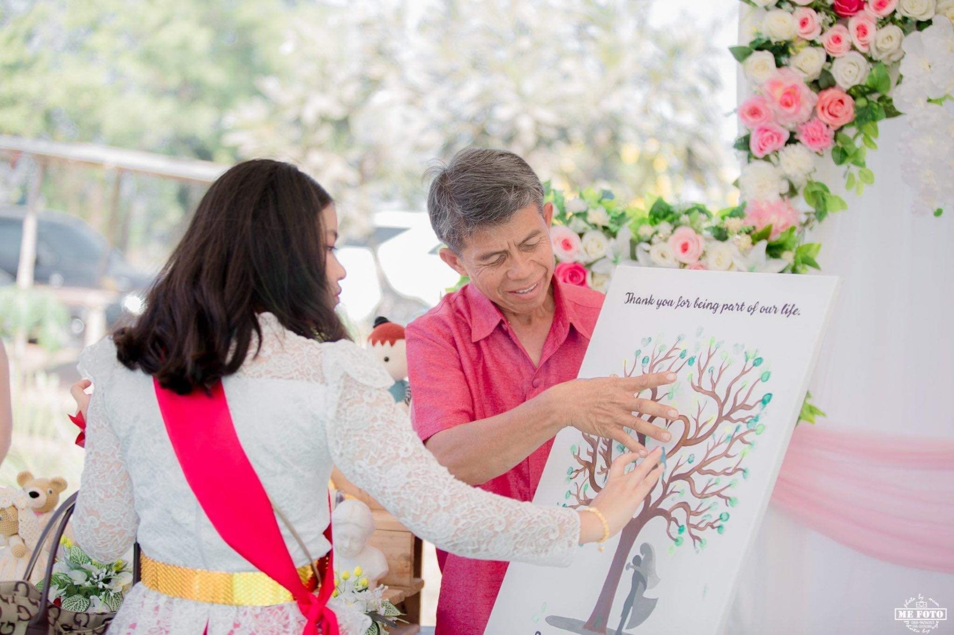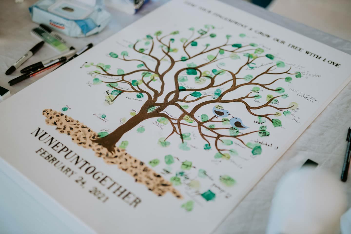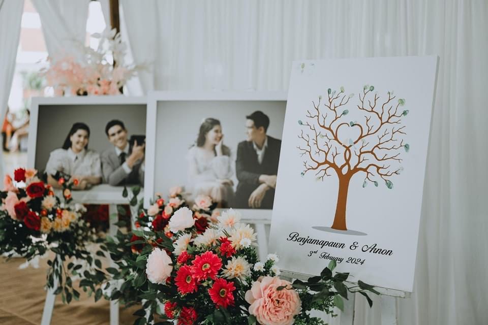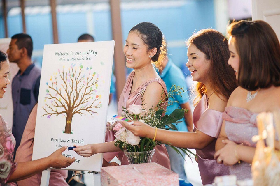 Fingerprint Guestbook ป้ายปั๊มนิ้วต้นไม้ลงนาม จัดว่าเป็นอีกหนึ่งไอเทมพร็อพเขียนอวยพรงานแต่งที่มาแรงมากๆเช่นกันค่ะ!! เป็นกิจกรรมที่ให้แขกมาช่วยกันปั๊มนิ้วด้วยหมึกสีสันสดใส หรือเขียนอวยพรลงบนต้นไม้ก็ได้ เปรียบเสมือนให้แขกได้มีส่วนร่วมมาช่วยเติมเต็มให้ต้นความรักของบ่าวสาว ให้ผลิใบออกดอกอย่างสมบูรณ์แบบในวันงานค่ะ